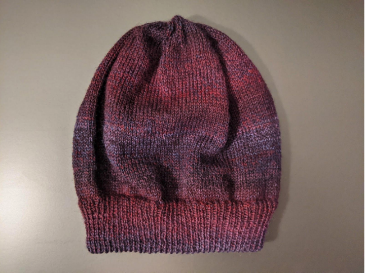 Machine knitting pattern, requires a ribber. Knit the ribbing flat, join for circular knitting for the hat body. Decreases can be worked on the machine or by hand.